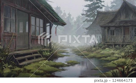 AIイラスト、廃墟になったホテル外観、古い家屋