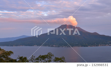 鹿児島県鹿児島市 城山公園展望台から望む噴煙を上げる朝の桜島