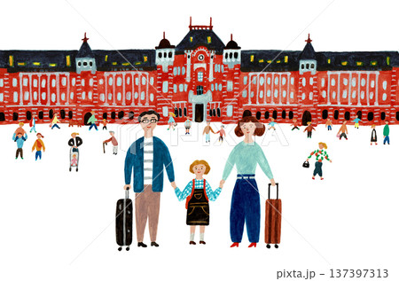 東京駅と旅行する家族の観光イメージイラスト