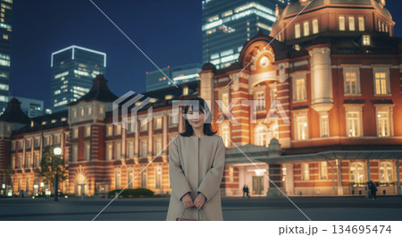 東京駅前の広場で女性が立つ