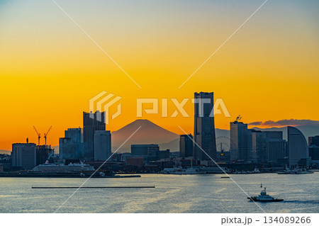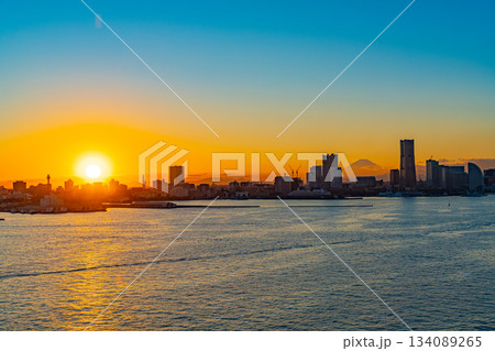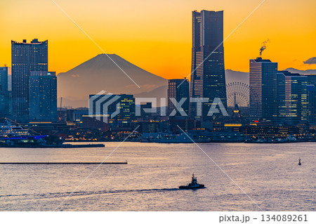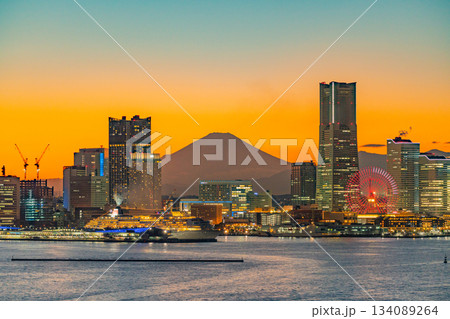 【神奈川県】富士山を望む、横浜みなとみらいの夕景