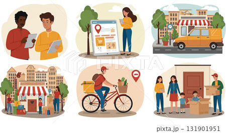 オンライン注文と自転車配送が行き交う街の風景イラスト