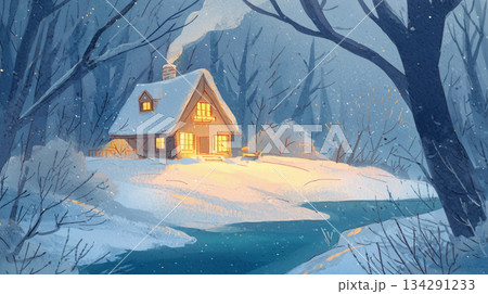 雪の森に佇む暖かい光の小屋の手描き風イラスト
