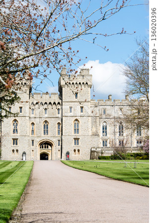 明るい日差しの下の枝木と芝生に囲まれた歴史的な石造りの建物 ロンドン郊外のウィンザーにて