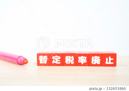 ガソリン暫定税率廃止を示す6個の赤ブロック。白背景にコピースペース。