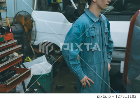 タイヤチェンジャーを使いタイヤの組み替えをするメカニック・整備士の男性作業員
