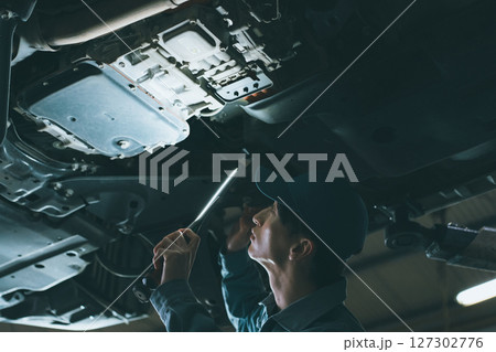 メカニッククリーパーに乗り車の下回りをチェックする自動車整備士の男性