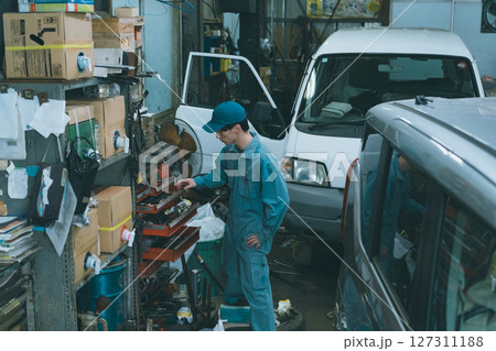 タイヤラックからスタットレスタイヤを運ぶ整備士・メカニックの男性
