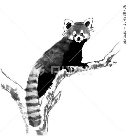 水墨技法で描いた木の上のレッサーパンダ
