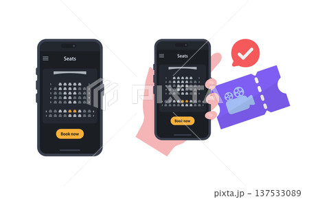 スマートフォンで映画チケットをオンライン予約するシネマ予約アプリのフラットベクターイラスト