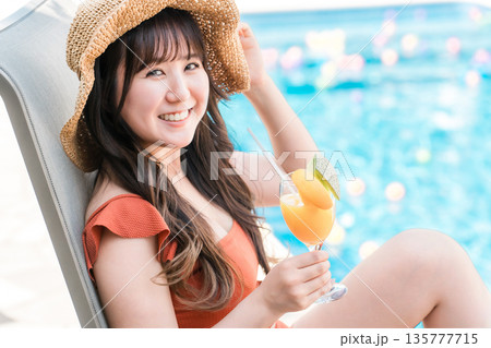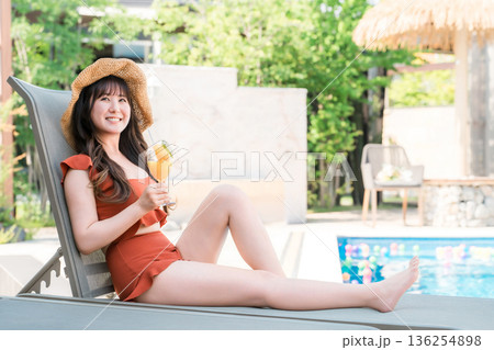 プールサイドのリクライニングチェアに座りトロピカルジュースを飲む水着姿の若いアジア人女性