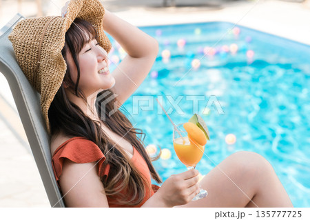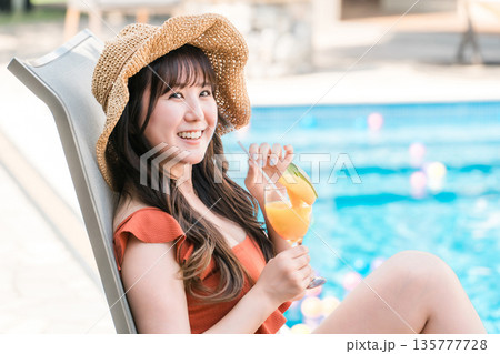 プールサイドのリクライニングチェアに座りトロピカルジュースを飲む若いアジア人女性