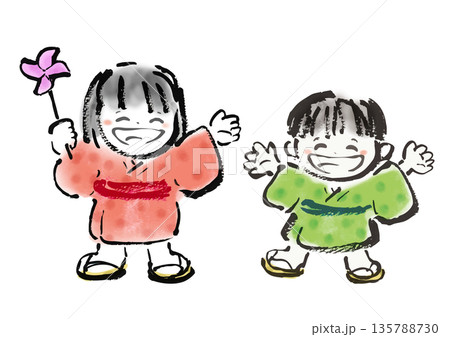 筆書きの日本の昔話風の笑顔の着物の子ども和風イラスト素材