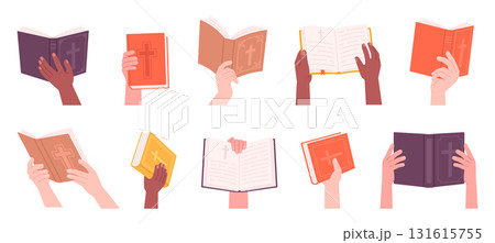 Hands with bible. Human hands holding holy bible, christian religious college, school education. People with book praying, church study racy vector set