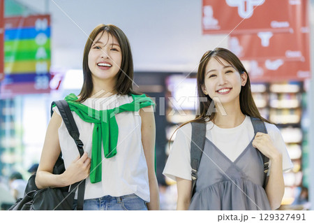 図書館に立つ若い女性