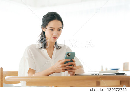 リビングでスマホを見る30代女性