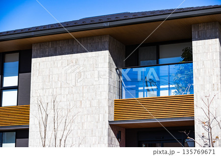 洋風のおしゃれな家が建ち並ぶ風景と爽やかな青空