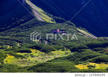 北アルプス・弓折岳稜線のトリカブト群落と双六小屋