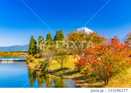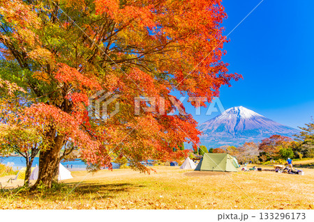 秋のキャンプ場のイメージ 紅葉の田貫湖キャンプ場から望む富士山