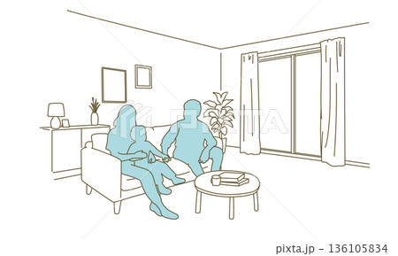 リビングで家族団らんイメージのシンプルイラスト