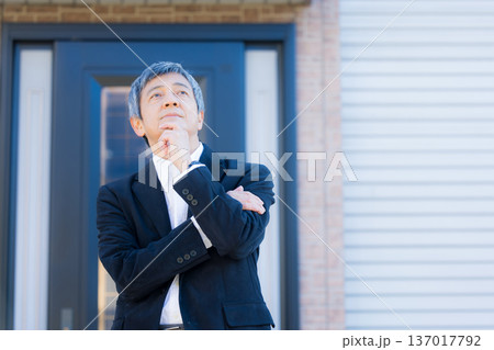 社屋建物の前で考える60代男性