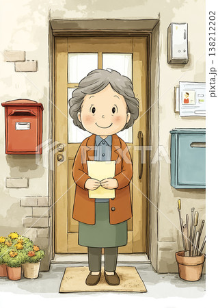 玄関先で手紙を持つシニア女性のイラスト