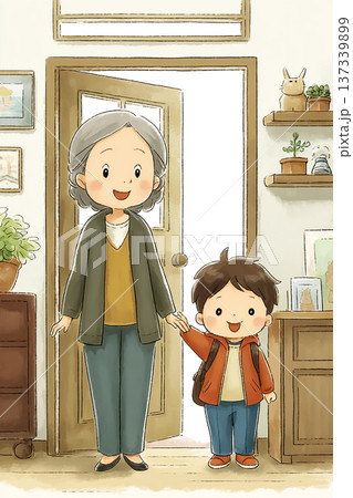 玄関で迎える祖母と孫|家庭の温かい帰宅シーンイラスト