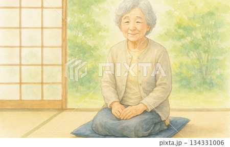 和室で座布団に正座し微笑む高齢女性の穏やかな暮らし