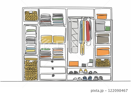 Single continuous line drawing wardrobe with several compartments containing boxes made of woven rattan. Arrange contents of the cupboard neatly. Get Organized Day. One line design vector illustration