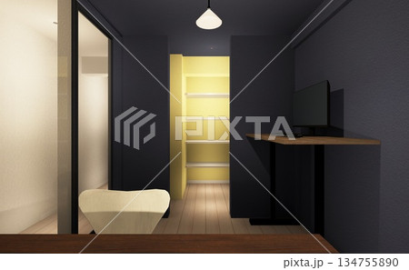 壁面収納とPCデスクが備え付けられたモダンで都会的な書斎のイラスト