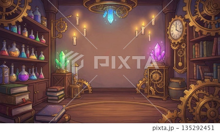 歯車とクリスタルが輝く魔法と科学が融合したスチームパンク風の部屋