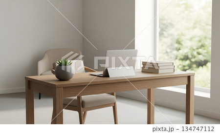 窓辺の自然光に照らされた木製デスクとノートパソコンのある室内
