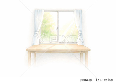 やわらかな光が差し込む窓辺と木のテーブルの水彩風イラスト素材
