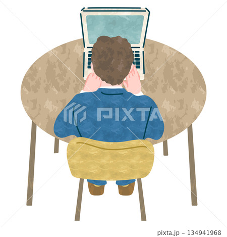 椅子に座ってパソコン操作する男性(俯瞰・後ろ姿)