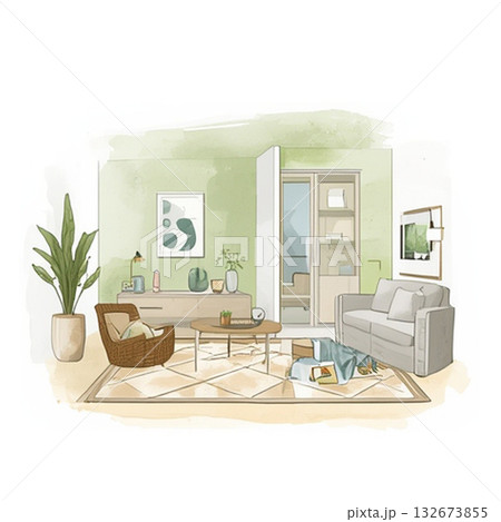 寝室 洋服ラック 観葉植物 水彩イラスト