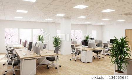 明るく開放的なオープンオフィス空間|春を感じる現代的な職場環境