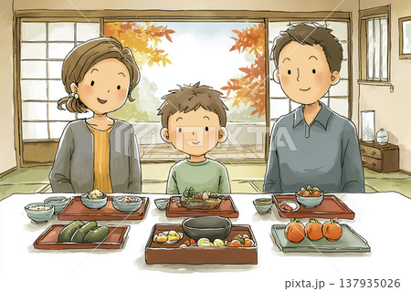 旅館の部屋で夕食を楽しむ家族旅行のイラスト素材