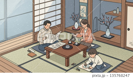 桜舞う日本家屋で安らぎの眠りにつく親子