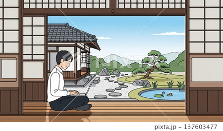 日本家屋と庭園の風景、静寂