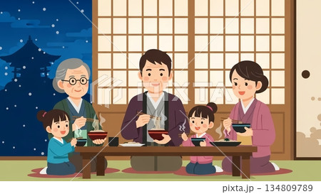 大晦日の夜 家族でこたつに入り年越しそばを食べるイラスト