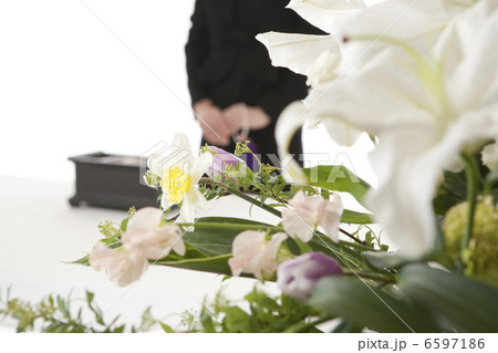焼香台の前に立つ喪服姿の女性と祭壇の花