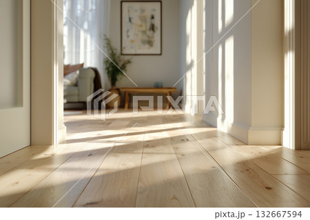 温かみのある木目フローリングと柔らかな自然光のミニマルな白い部屋