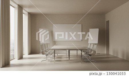 明るい日差しが差し込む現代的なオフィス, パソコンが整然と並ぶシンプルな職場, 清潔感ある無人のワー