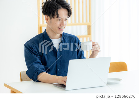明るい自宅でノートパソコンを使ってテレワークする女性