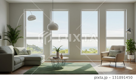 大きな窓から光が差し込むナチュラルテイストの明るいリビングルーム