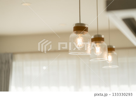 くもったガラスシェードのペンダントライトとカフェの雰囲気