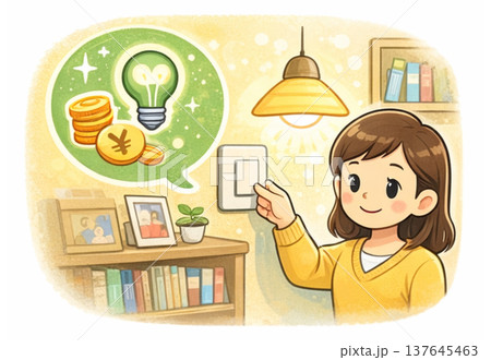 節電と節約を意識して電気のスイッチを切る女性のイラスト
