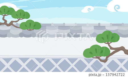 瓦屋根の塀と空の和風な背景イラスト_松と地面_16:9
