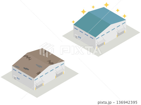 アイソメトリックな工場や倉庫の建物の屋根の修繕のビフォーアフター素材