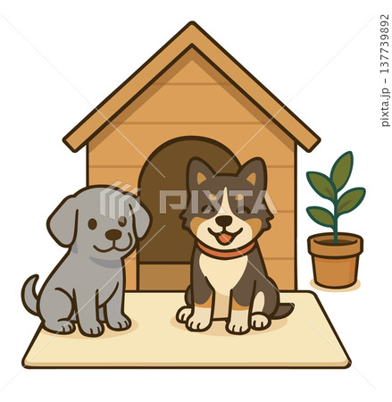 犬小屋の前でおすわりする2匹の仲良し子犬のイラスト